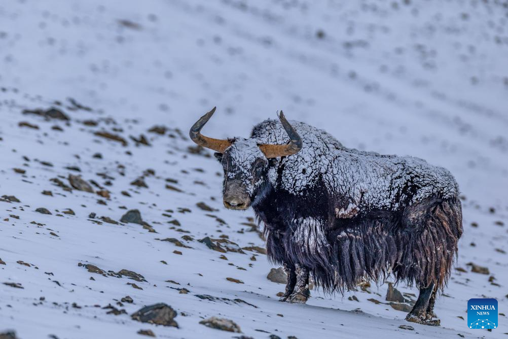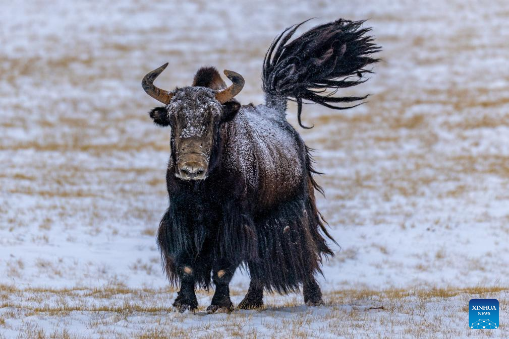 A wild yak is pictured at the Bamoqongzong extinct volcanic cluster area in the Changtang National Nature Reserve, southwest China's Xizang Autonomous Region, April 9, 2026. The Bamoqongzong extinct volcanic cluster is located deep within the Changtang National Nature Reserve, at an average elevation of approximately 5,000 meters. (Xinhua/Jiang Fan)
