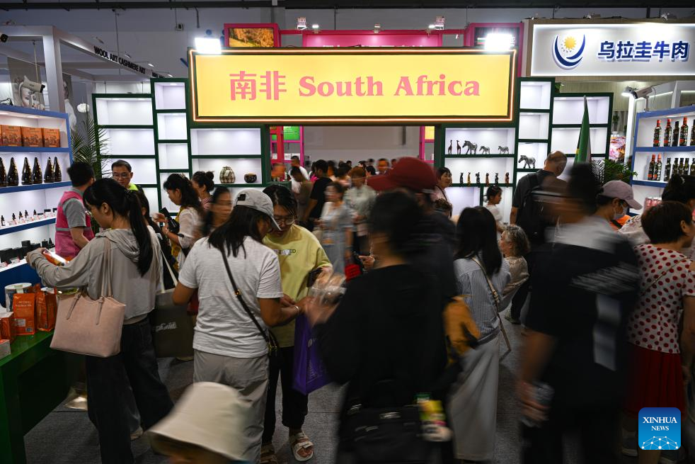 This photo taken on April 16, 2026 shows a view of the pavilion of South Africa at the sixth China International Consumer Products Expo (CICPE) in Haikou, south China's Hainan Province. As a major event showcasing the Hainan Free Trade Port (FTP) after it fully launched island-wide special customs operations in December last year, the sixth China International Consumer Products Expo (CICPE) kicked off on Monday in Haikou, capital of south China's Hainan Province, attracting more than 3,400 brands from over 60 countries and regions.