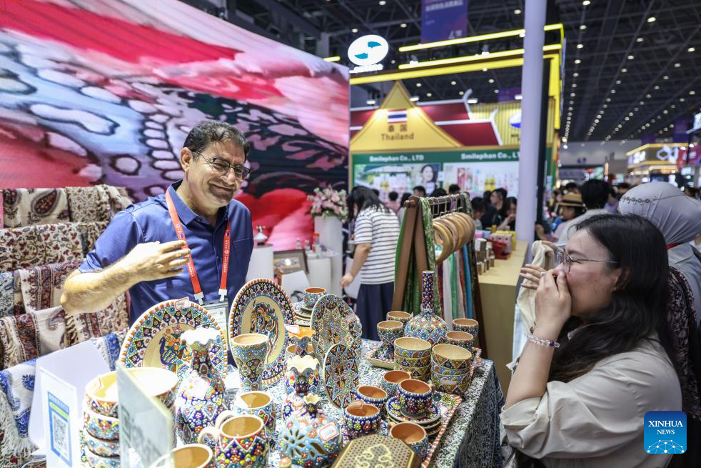 Visitors learn about Iranian handicrafts during the sixth China International Consumer Products Expo (CICPE) in Haikou, south China's Hainan Province, April 15, 2026. As a major event showcasing the Hainan Free Trade Port (FTP) after it fully launched island-wide special customs operations in December last year, the sixth China International Consumer Products Expo (CICPE) kicked off on Monday in Haikou, capital of south China's Hainan Province, attracting more than 3,400 brands from over 60 countries and regions.