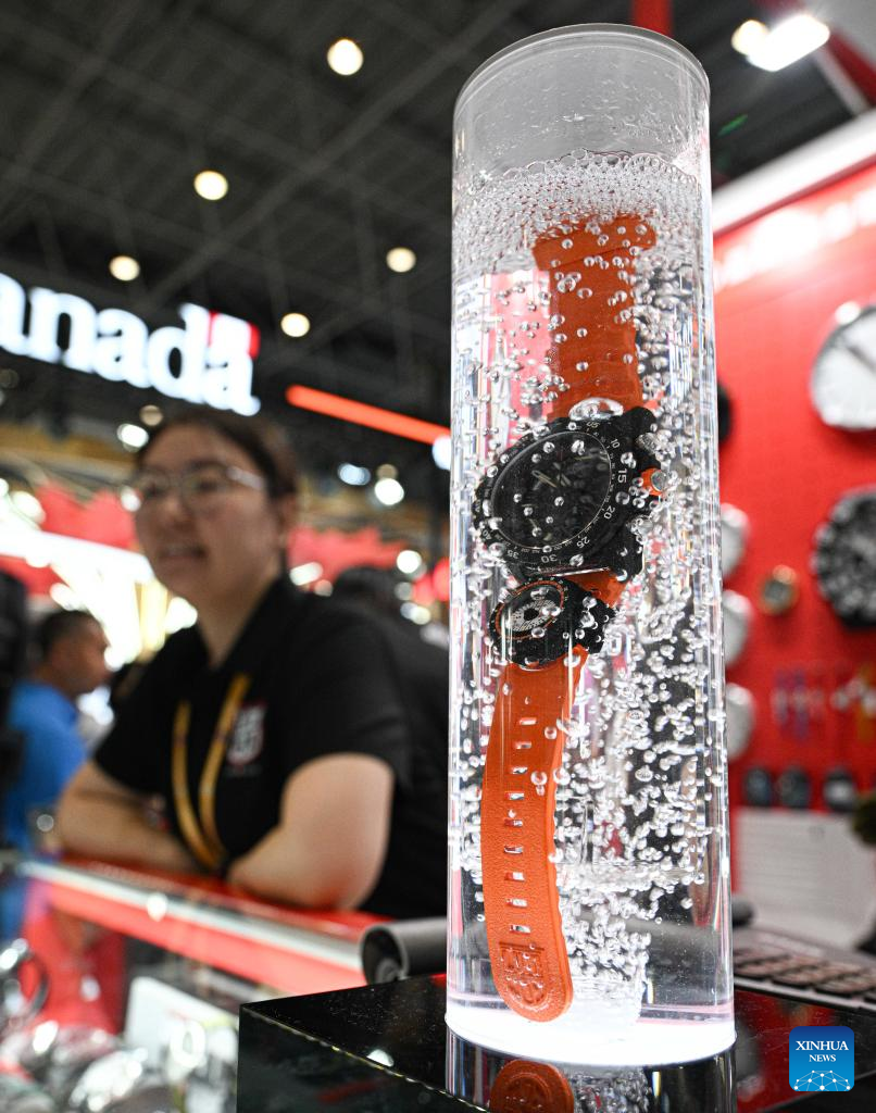 This photo taken on April 16, 2026 shows a watch exhibited at the pavilion of Switzerland during the sixth China International Consumer Products Expo (CICPE) in Haikou, south China's Hainan Province. As a major event showcasing the Hainan Free Trade Port (FTP) after it fully launched island-wide special customs operations in December last year, the sixth China International Consumer Products Expo (CICPE) kicked off on Monday in Haikou, capital of south China's Hainan Province, attracting more than 3,400 brands from over 60 countries and regions.