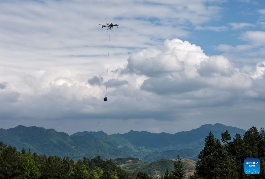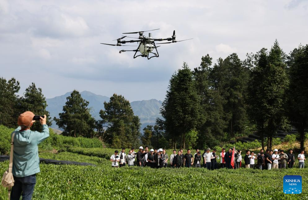 An aerial drone photo taken on April 17, 2026 shows a drone operated by an instructor for demonstration at a tea garden in Baicha Village of Yundong Town, Duyun City of Qiannan Bouyei and Miao Autonomous Prefecture, southwest China's Guizhou Province. Trainees on an agricultural drone application training course in Guizhou Province took part in practical exercises in Duyun City on Friday to improve their skills in operating crop protection drones. (Xinhua/Yang Wenbin)