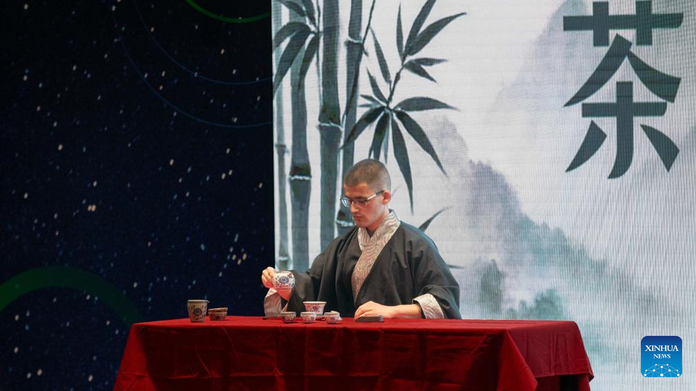 A contestant gives tea art performance during a Chinese language competition marking the 17th United Nations Chinese Language Day in Nis, Serbia, April 16, 2026. (Photo by Wang Wei/Xinhua)