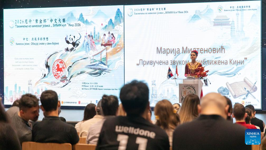 A contestant delivers a speech in Chinese during a Chinese language competition marking the 17th United Nations Chinese Language Day in Nis, Serbia, April 16, 2026. (Photo by Wang Wei/Xinhua)