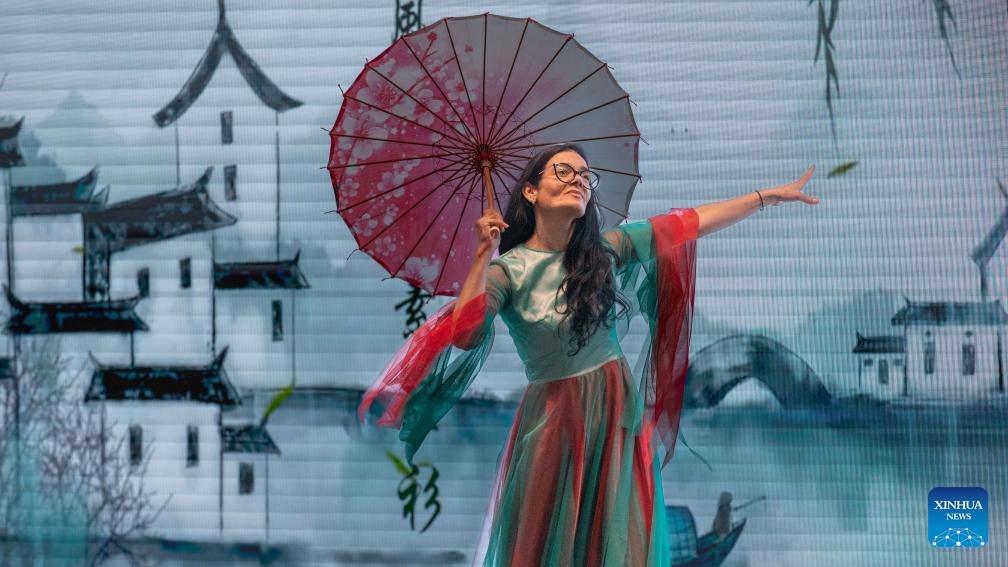A contestant performs during a Chinese language competition marking the 17th United Nations Chinese Language Day in Nis, Serbia, April 16, 2026. (Photo by Wang Wei/Xinhua)