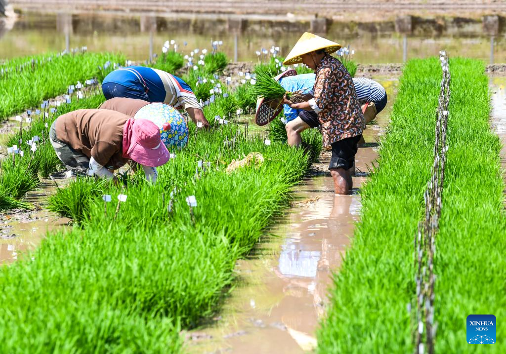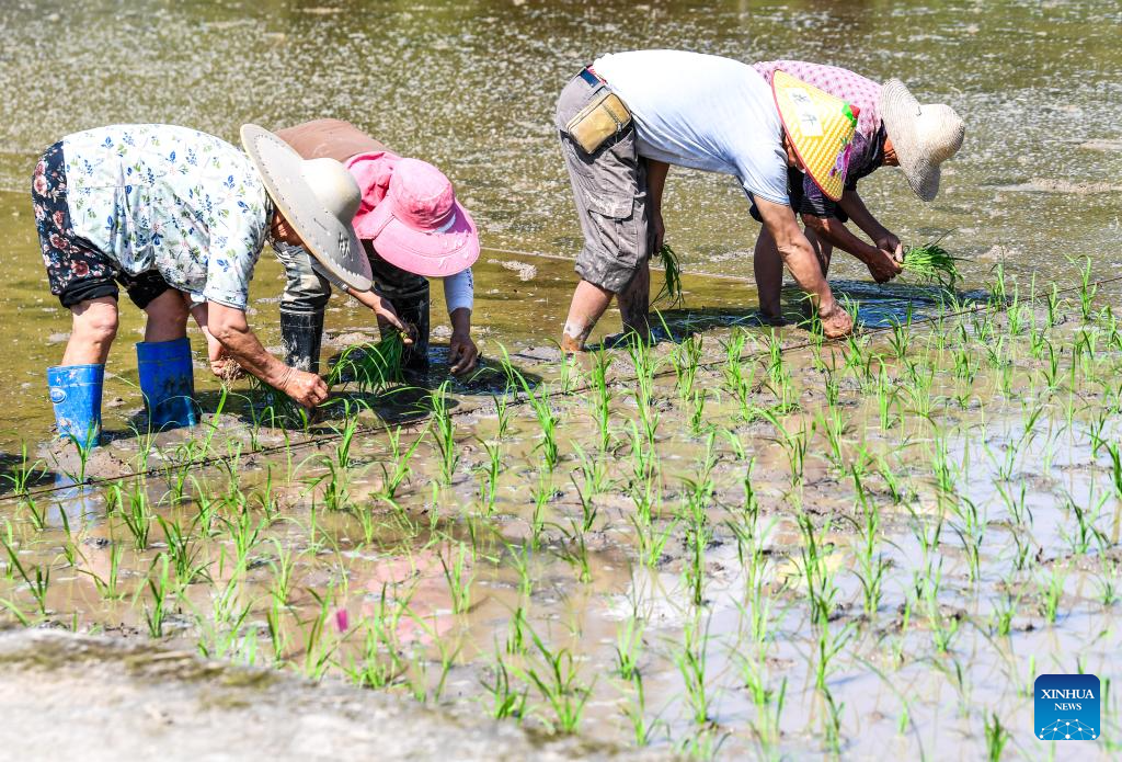 Farmers transplant rice seedlings in the fields of Weituo Town, Hechuan District, southwest China's Chongqing, April 18, 2026. The fields in Hechuan District of Chongqing are bustling with farming activity during the spring plowing season.