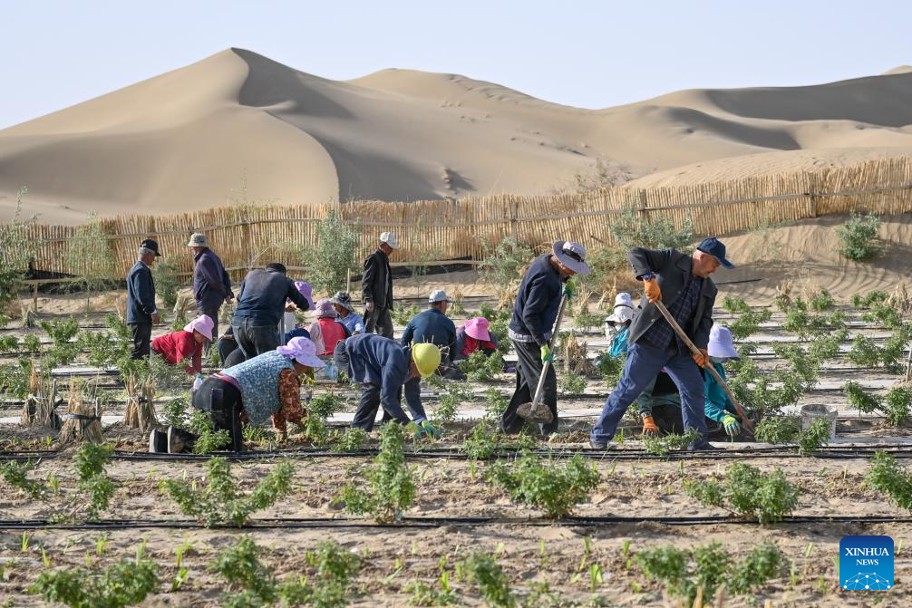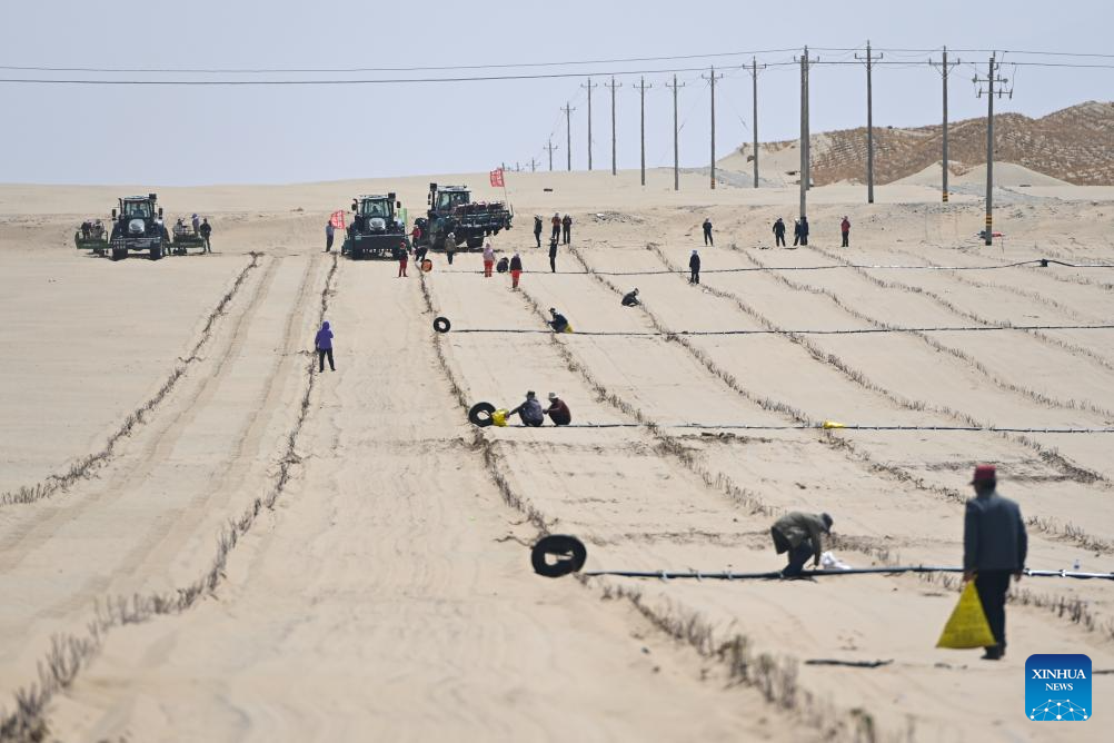 Villagers transplant roses and Scutellaria baicalensis, a plant used in traditional Chinese medicine, and lay drip irrigation tapes on the Taklimakan Desert in Yutian County, northwest China's Xinjiang Uygur Autonomous Region, April 15, 2026.