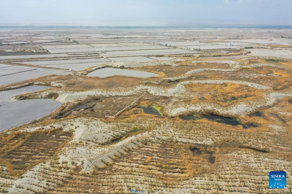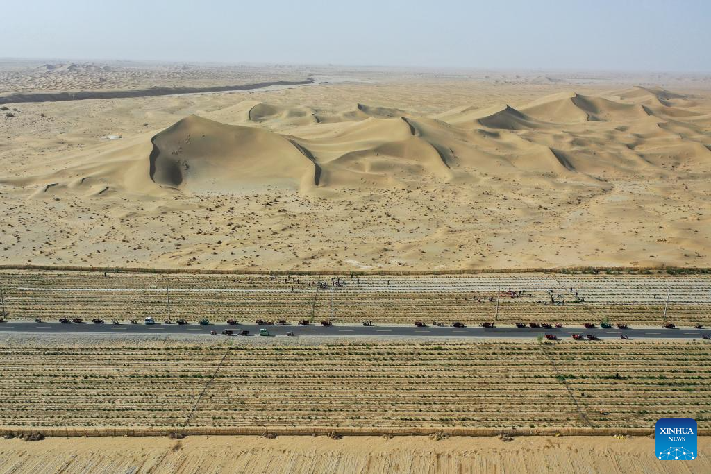 An aerial drone photo shows a view of an ecological restoration and sand control project in Awat County, northwest China's Xinjiang Uygur Autonomous Region, April 14, 2026.