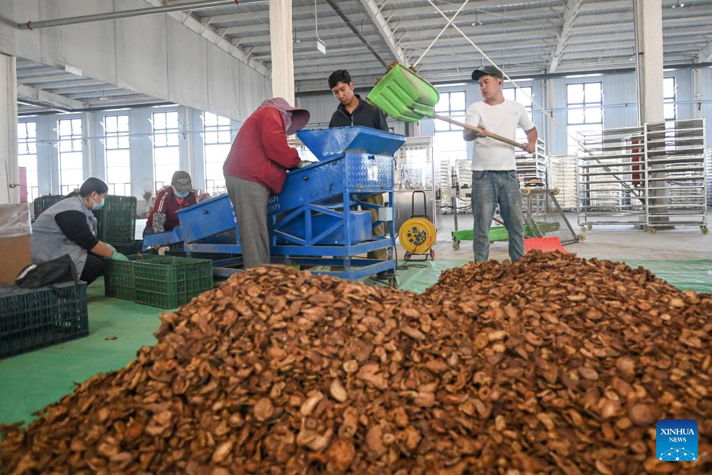 Staff members sort slices of Cistanche deserticola, a Chinese herbal medicine, at an agricultural technology company in Aksu, northwest China's Xinjiang Uygur Autonomous Region, April 14, 2026.
