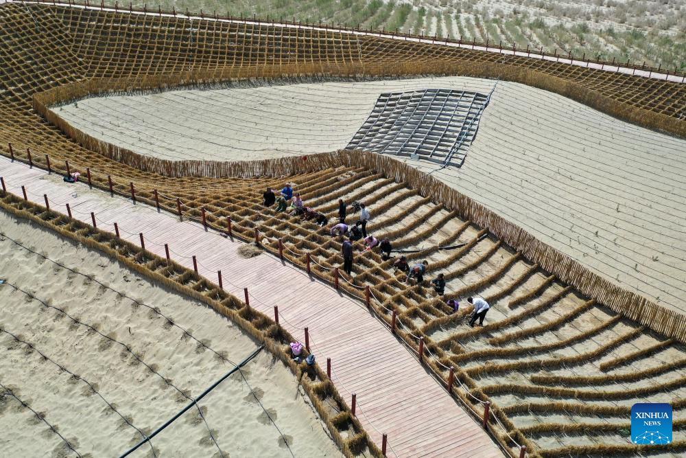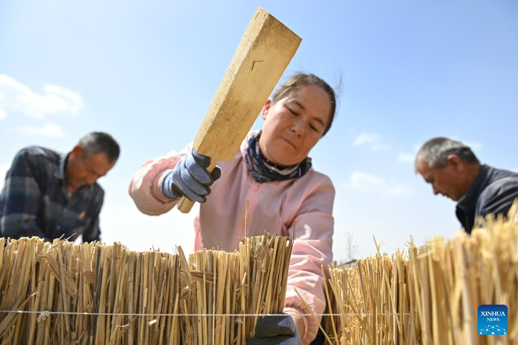 Villagers make straw checkerboard barriers in Yutian County, northwest China's Xinjiang Uygur Autonomous Region, April 15, 2026.