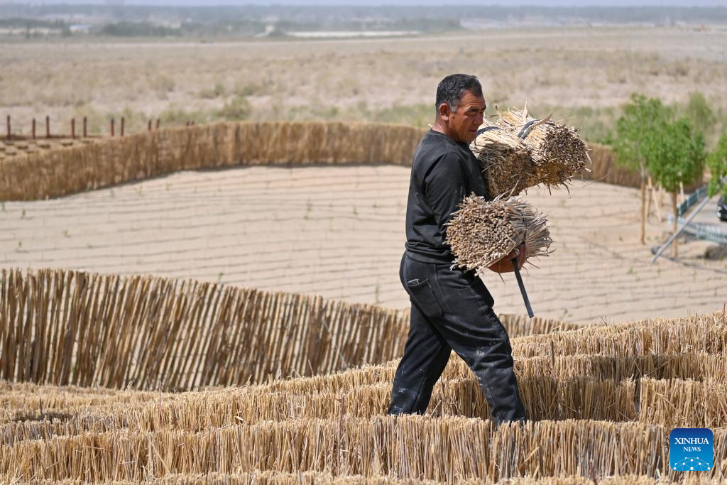 A villager carries dry reeds to be made for straw checkerboard barriers on the Taklimakan Desert in Yutian County, northwest China's Xinjiang Uygur Autonomous Region, April 15, 2026.