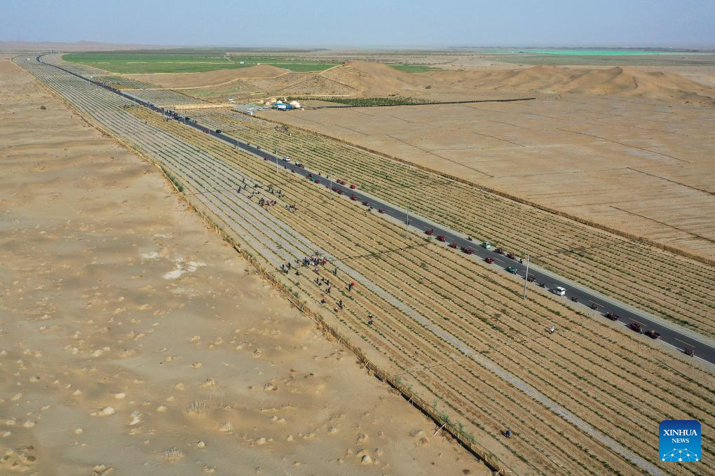 Along the southern edge of Taklimakan Desert, vibrant green barriers extend into the horizon, where fruit trees take root in and sand-fixing forests stand resilient against the desert sands, reflecting the growing ecological and economic vitality of southern Xinjiang in far western China.