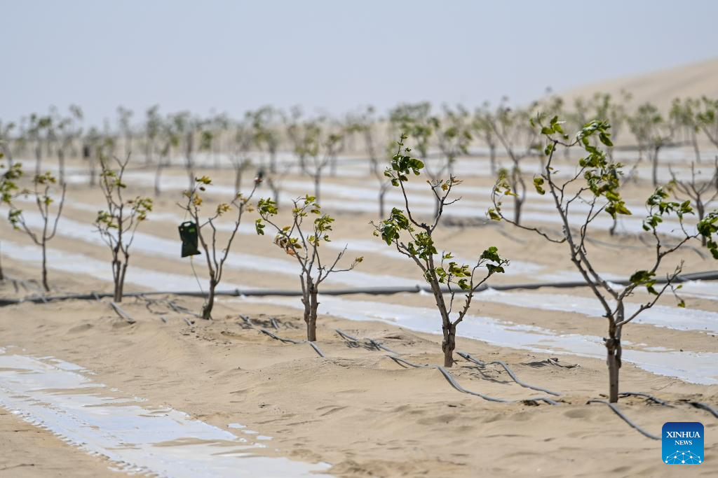 This photo taken on April 16, 2026 shows pistachio tree seedlings at the Taklimakan Desert in Hotan County, northwest China's Xinjiang Uygur Autonomous Region.