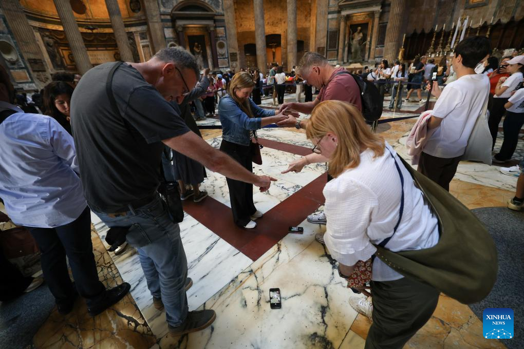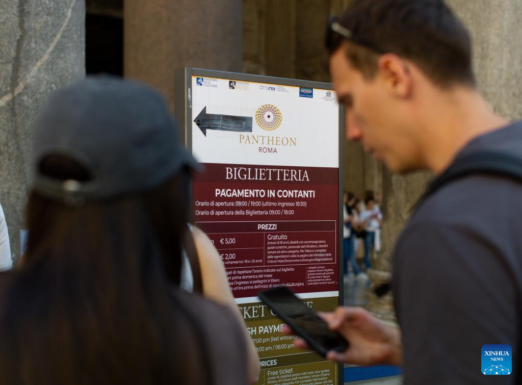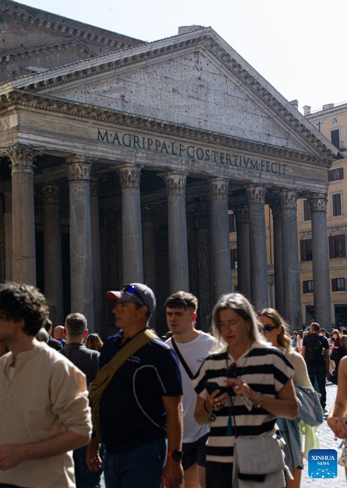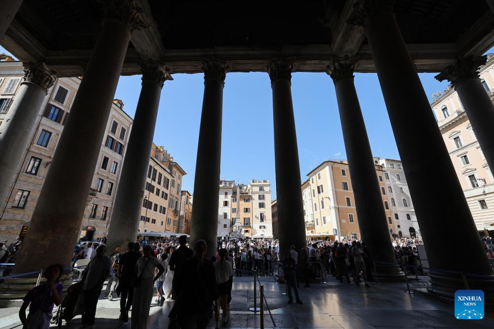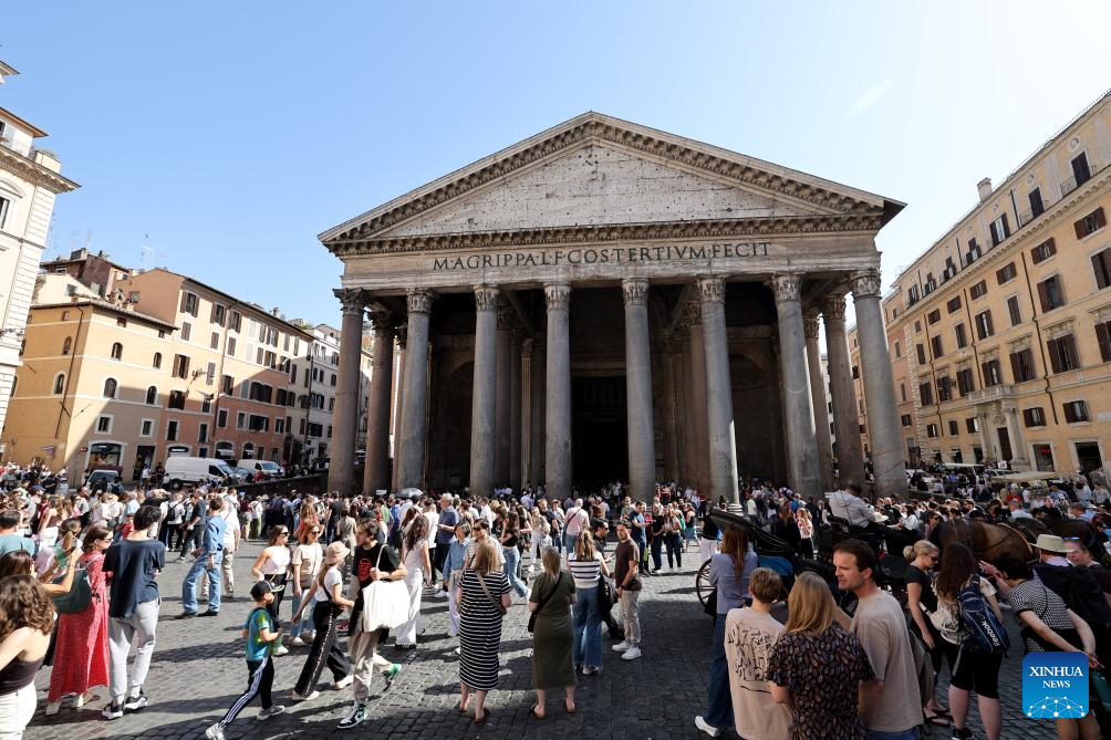 Tourists are seen outside the Pantheon in Rome, Italy, April 17, 2026. According to a recent announcement by Italy's Ministry of Culture, the entry fee for tourists visiting the Pantheon in Rome will rise from 5 euros to 7 euros, with the change taking effect on July 1, 2026. (Xinhua/Li Jing)