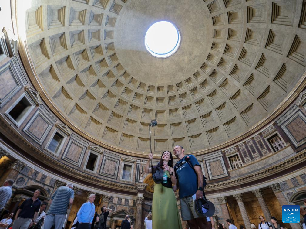 Tourists take selfies at the Pantheon in Rome, Italy, April 17, 2026. According to a recent announcement by Italy's Ministry of Culture, the entry fee for tourists visiting the Pantheon in Rome will rise from 5 euros to 7 euros, with the change taking effect on July 1, 2026. (Xinhua/Li Jing)