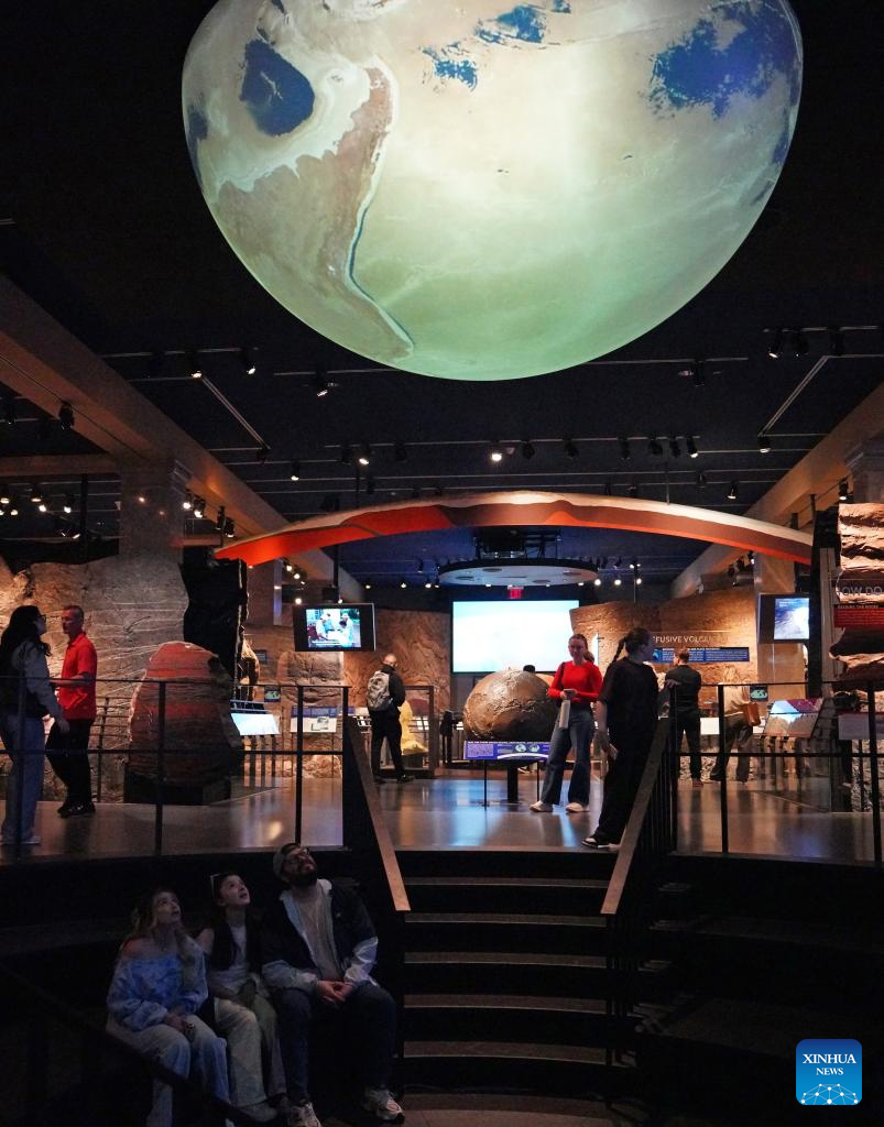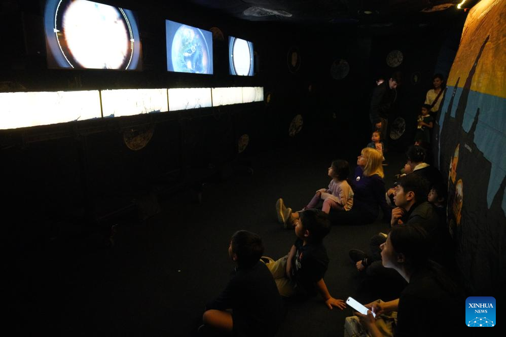 People watch a video titled In Search of Earth's Secretes during a festival celebrating the upcoming Earth Day at the American Museum of Natural History in New York, the United States, on April 18, 2026. An all-ages festival titled Earthfest was held at the American Museum of Natural History in New York on Saturday to celebrate the upcoming Earth Day, an annual event on April 22, with hands-on activities, science trivia, specimen identification stations, and more. (Xinhua/Zhang Fengguo)