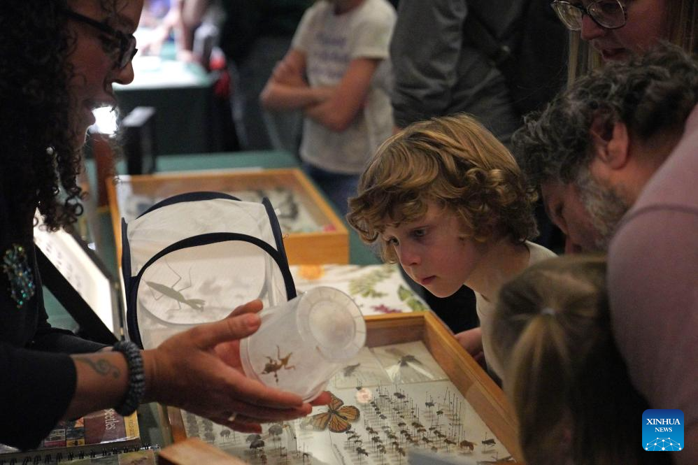 A visitor observes a specimen during a festival celebrating the upcoming Earth Day at the American Museum of Natural History in New York, the United States, on April 18, 2026. An all-ages festival titled Earthfest was held at the American Museum of Natural History in New York on Saturday to celebrate the upcoming Earth Day, an annual event on April 22, with hands-on activities, science trivia, specimen identification stations, and more. (Xinhua/Zhang Fengguo)