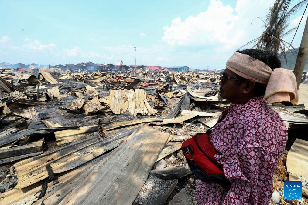 A resident looks at a coastal village after a fire in the northern Borneo state of Sabah, Malaysia, April 19, 2026. Hundreds of people have been displaced after a fire destroyed over 200 homes in a coastal village in the northern Borneo state of Sabah, Malaysian authorities said on Sunday. The fire broke out at 1:32 am local time, Sandakan district's fire and rescue chief Jimmy Lagung told Bernama. (Bernama/Handout via Xinhua)