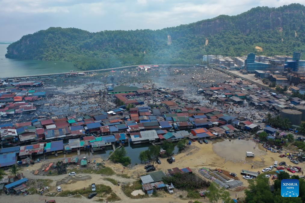 This photo taken on April 19, 2026 shows a coastal village after a fire in the northern Borneo state of Sabah, Malaysia. Hundreds of people have been displaced after a fire destroyed over 200 homes in a coastal village in the northern Borneo state of Sabah, Malaysian authorities said on Sunday.