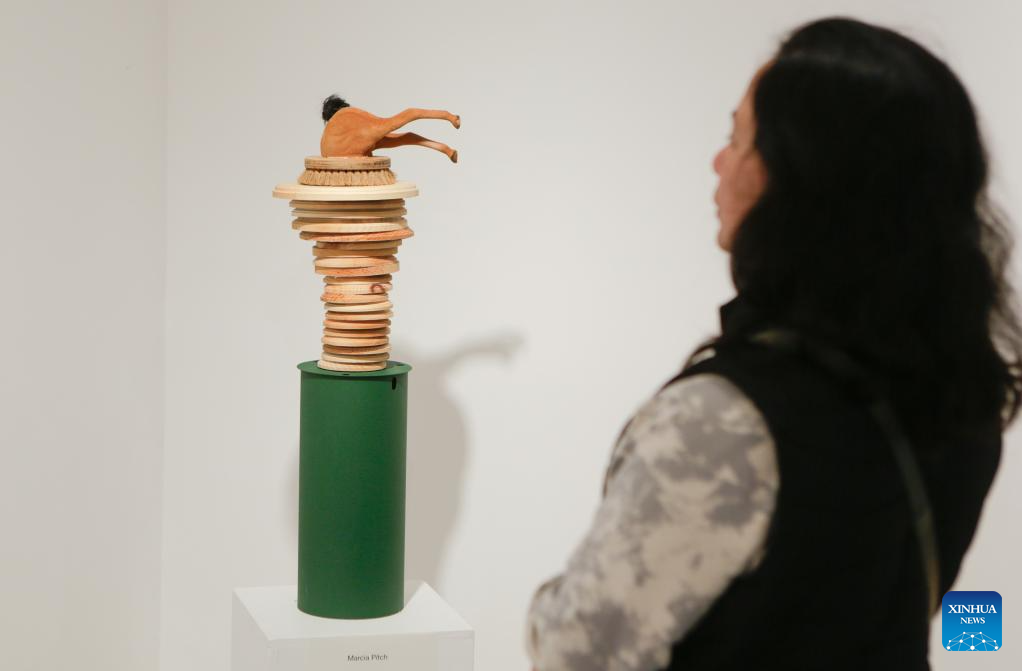 A visitor views artworks made from recycled materials at the "Art Against Climate Disaster" exhibition in Burnaby, Canada, April 18, 2026. The exhibition runs from April 16 to 25, featuring works from 19 artists using recycled materials in sculpture, painting and collage to highlight environmental challenges. (Photo by Liang Sen/Xinhua)