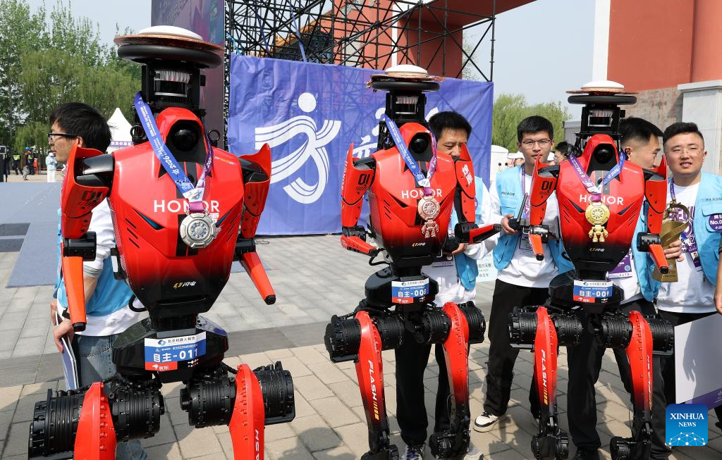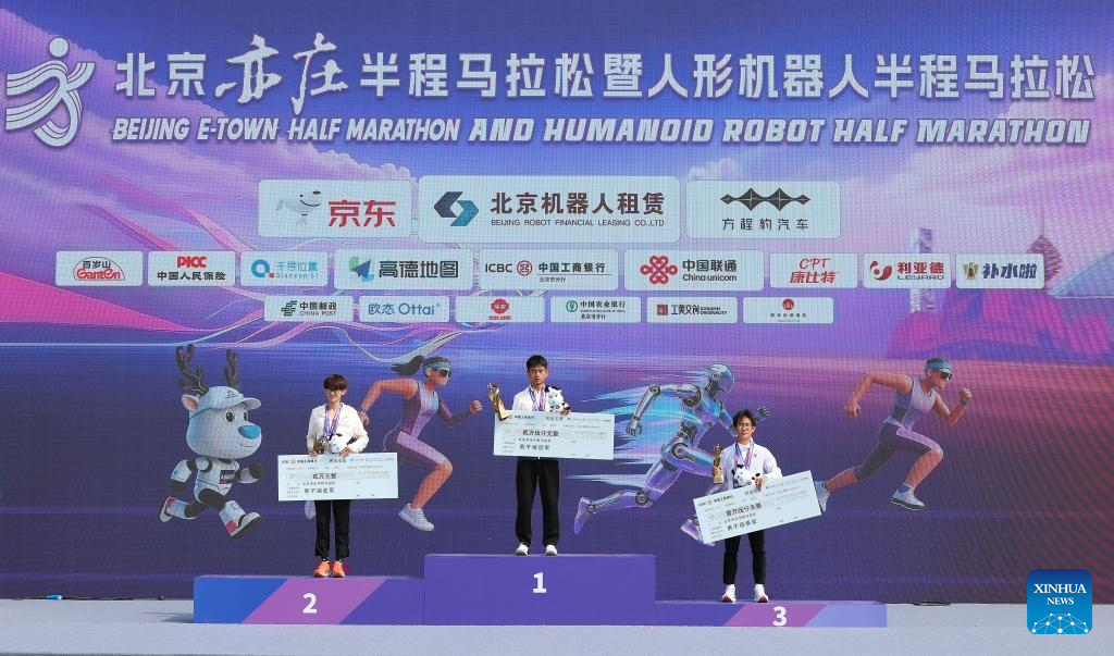 Gold medalists pose during the the awarding ceremony for the "Dare to Be" robots competition during the Beijing E-Town half-marathon and humanoid robots half-marathon in the Beijing Economic-Technological Development Area in southeast Beijing, China, April 19, 2026. (Xinhua/Zhang Chenlin)