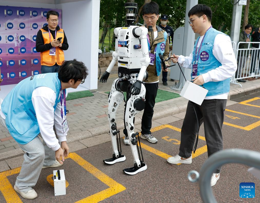 Engineers check the humanoid robot "Tiangong 3.0" (2nd L) of Zhipaozhe Team in the remote-controlled category during the Beijing E-Town half-marathon and humanoid robots half-marathon in the Beijing Economic-Technological Development Area in southeast Beijing, China, April 19, 2026. (Xinhua/Zhai Yifan)