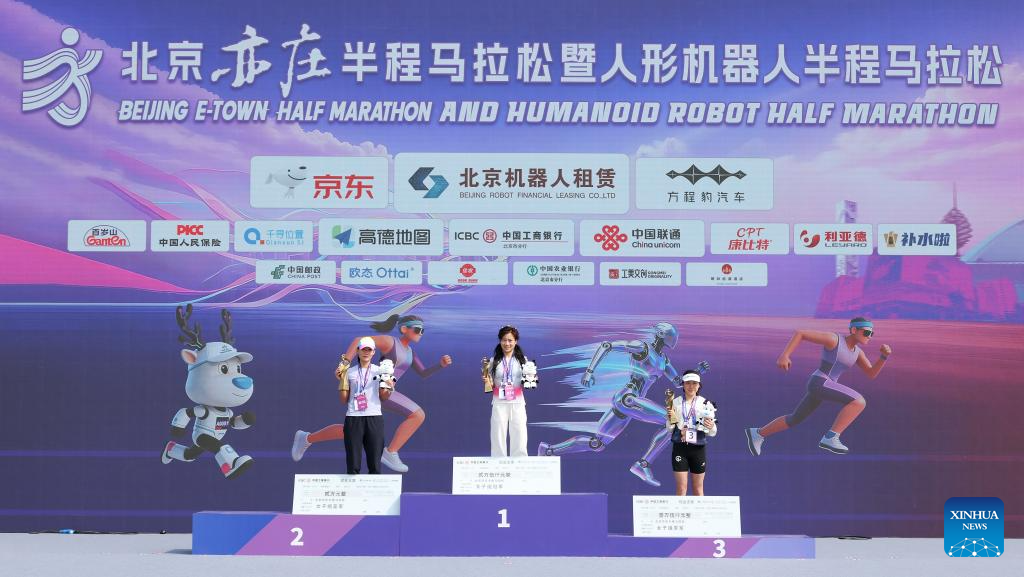 Gold medalist Wang Qiaoxia (C), silver medalist Yang Xiaoli (L) and bronze medalist Zhang Xiaomin display the medals and trophies during the awarding ceremony for the women's half-marathon at the Beijing E-Town half-marathon and humanoid robots half-marathon in the Beijing Economic-Technological Development Area in southeast Beijing, China, April 19, 2026. (Xinhua/Zhang Chenlin)