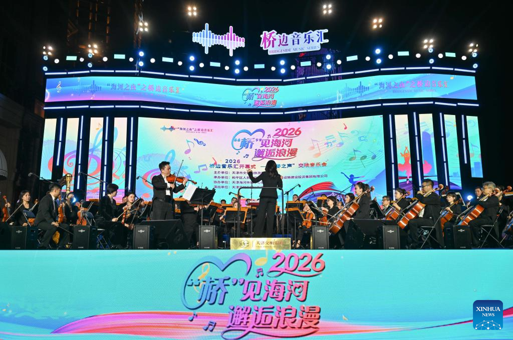 Citizens and tourists watch a music performance at the Jinwan Square by the Haihe River in north China's Tianjin, April 18, 2026. The Bridgeside Music Series kicked off here on Saturday. This event has been held for two consecutive sessions, and this year's performances will last until October.
