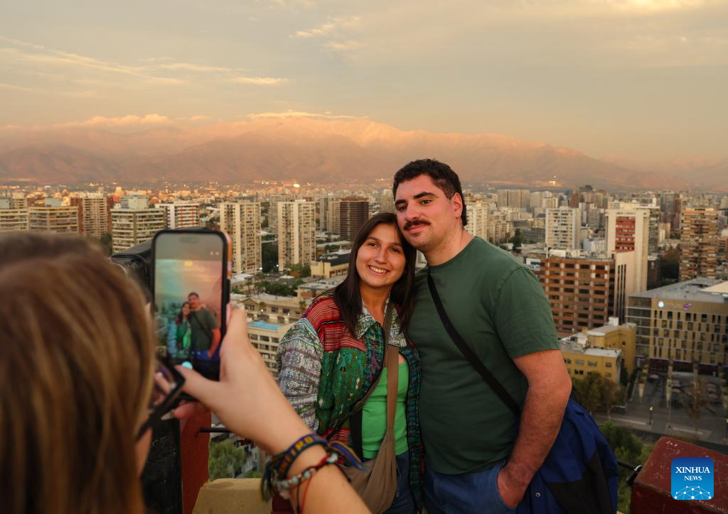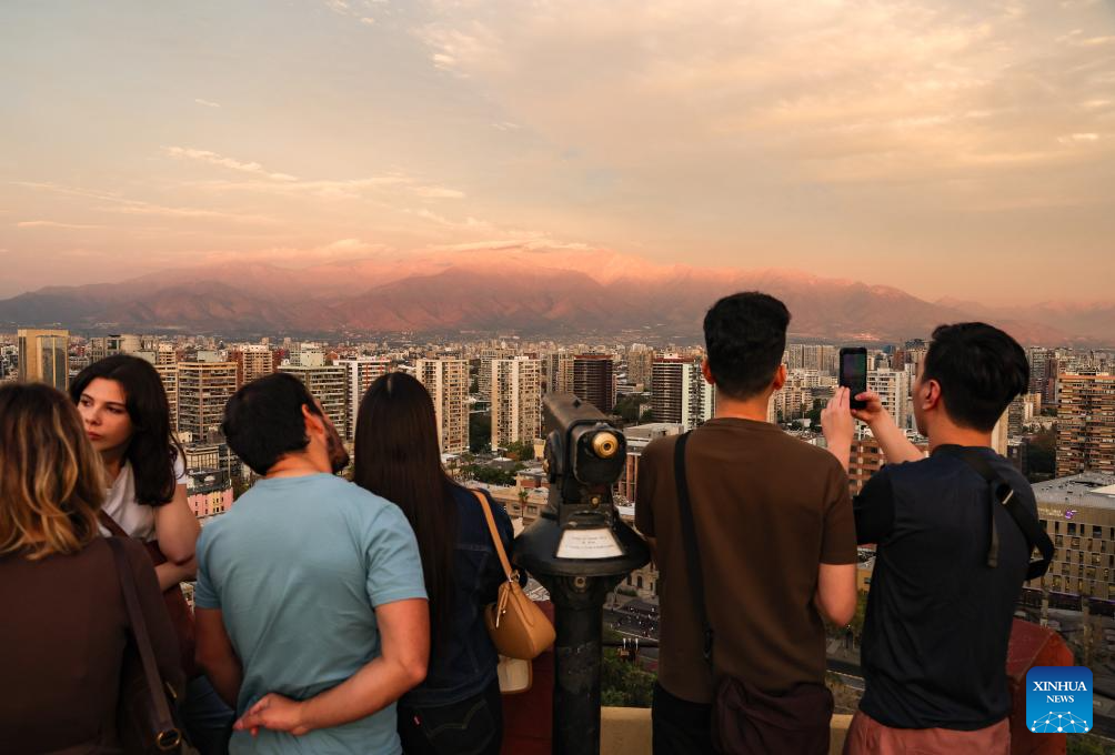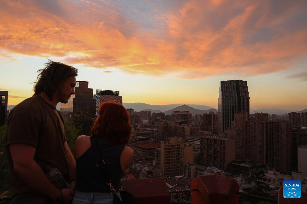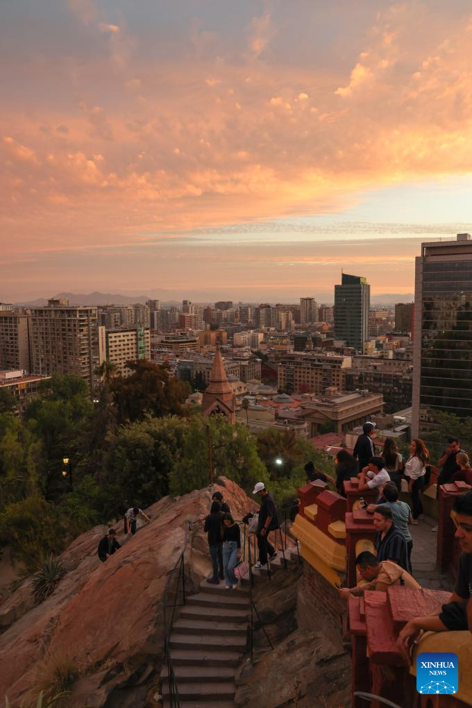 People enjoy the sunset glow at the Cerro Santa Lucía in Santiago, Chile, April 18, 2026. (Xinhua/Zhou Jiayi)