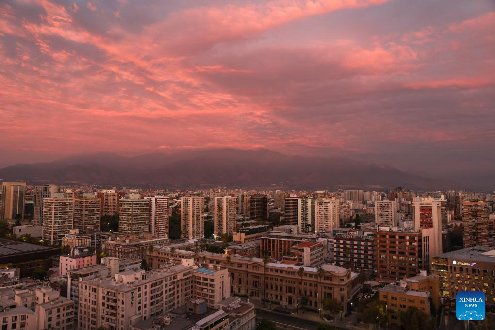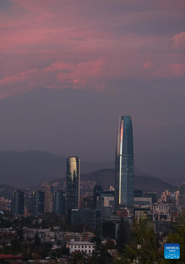 This photo taken on April 18, 2026 shows a view of the skyline at sunset in Santiago, Chile. (Xinhua/Zhou Jiayi)