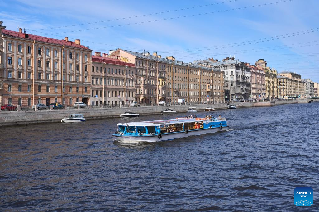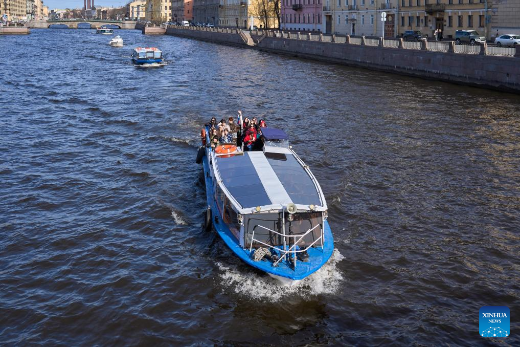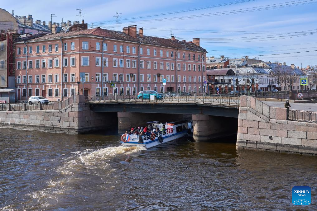 A sightseeing boat travels on the Fontanka River in St. Petersburg, Russia, April 19, 2026. St. Petersburg features a dense network of waterways and over 300 bridges crisscrossing the city. (Photo by Guo Feizhou/Xinhua)
