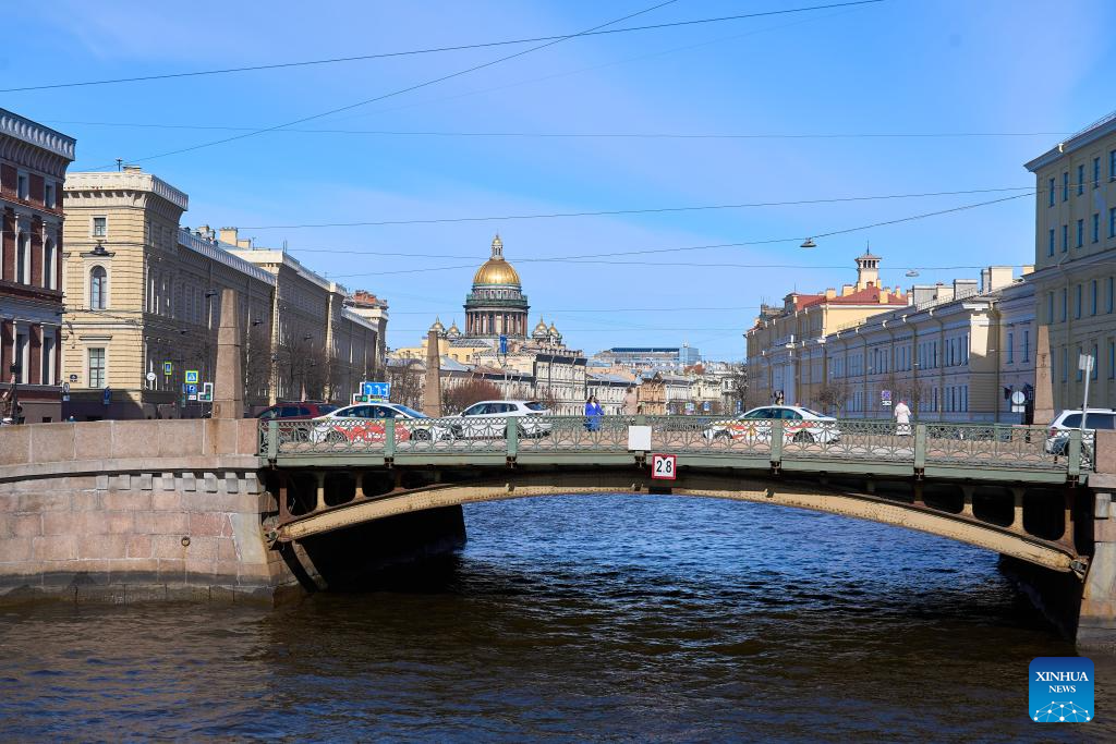 This photo taken on April 19, 2026 shows the scenery of the Moika River in St. Petersburg, Russia. St. Petersburg features a dense network of waterways and over 300 bridges crisscrossing the city. (Photo by Guo Feizhou/Xinhua)