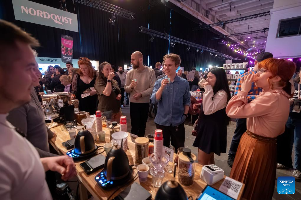 Visitors taste coffee at a booth at the Helsinki Coffee Festival 2026 held in Helsinki, the capital of Finland, April 19, 2026. The Helsinki Coffee Festival 2026 was held in Helsinki from April 17 to 19. More than 50 exhibitors showcased a wide range of products, including coffee, coffee equipment, tea beverages and ice cream. (Photo by Matti Matikainen/Xinhua)