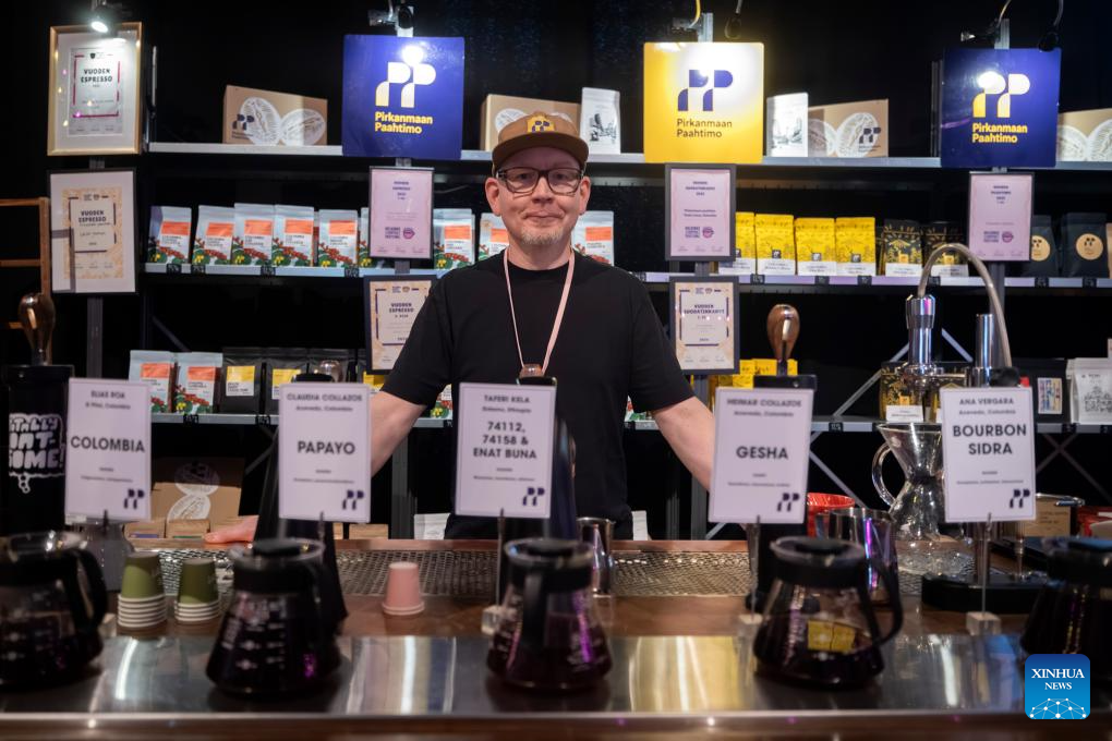 An exhibitor displays coffee products at the Helsinki Coffee Festival 2026 held in Helsinki, the capital of Finland, April 19, 2026. The Helsinki Coffee Festival 2026 was held in Helsinki from April 17 to 19. More than 50 exhibitors showcased a wide range of products, including coffee, coffee equipment, tea beverages and ice cream. (Photo by Matti Matikainen/Xinhua)
