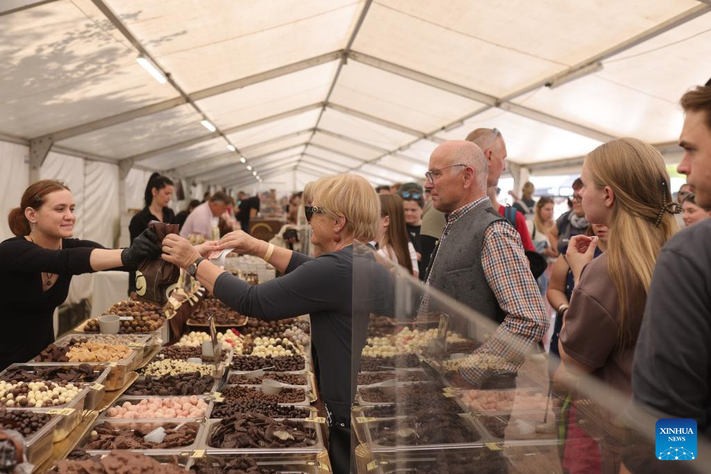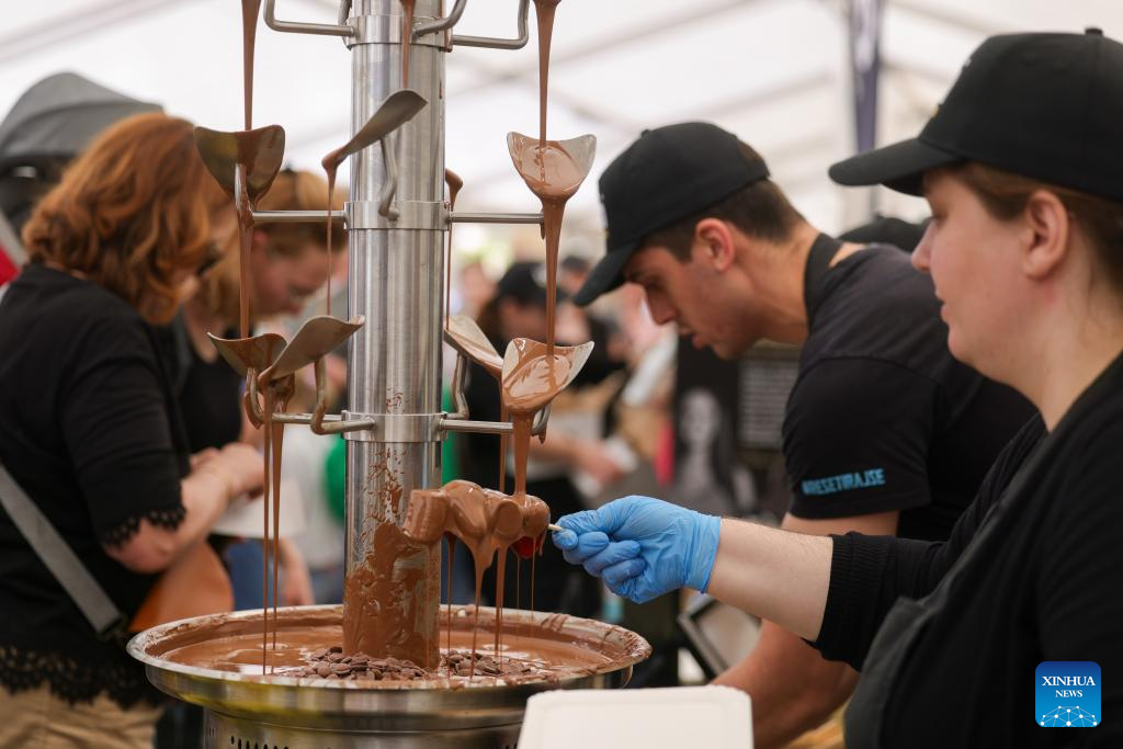 Visitors buy chocolates during the Radovljica Chocolate Festival in Radovljica, Slovenia, April 19, 2026. (Photo by Zeljko Stevanic/Xinhua)
