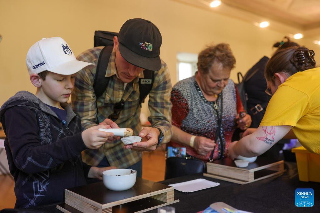 A boy learns how to make a chocolate dessert at a confectionery workshop during the Radovljica Chocolate Festival in Radovljica, Slovenia, April 19, 2026. (Photo by Zeljko Stevanic/Xinhua)