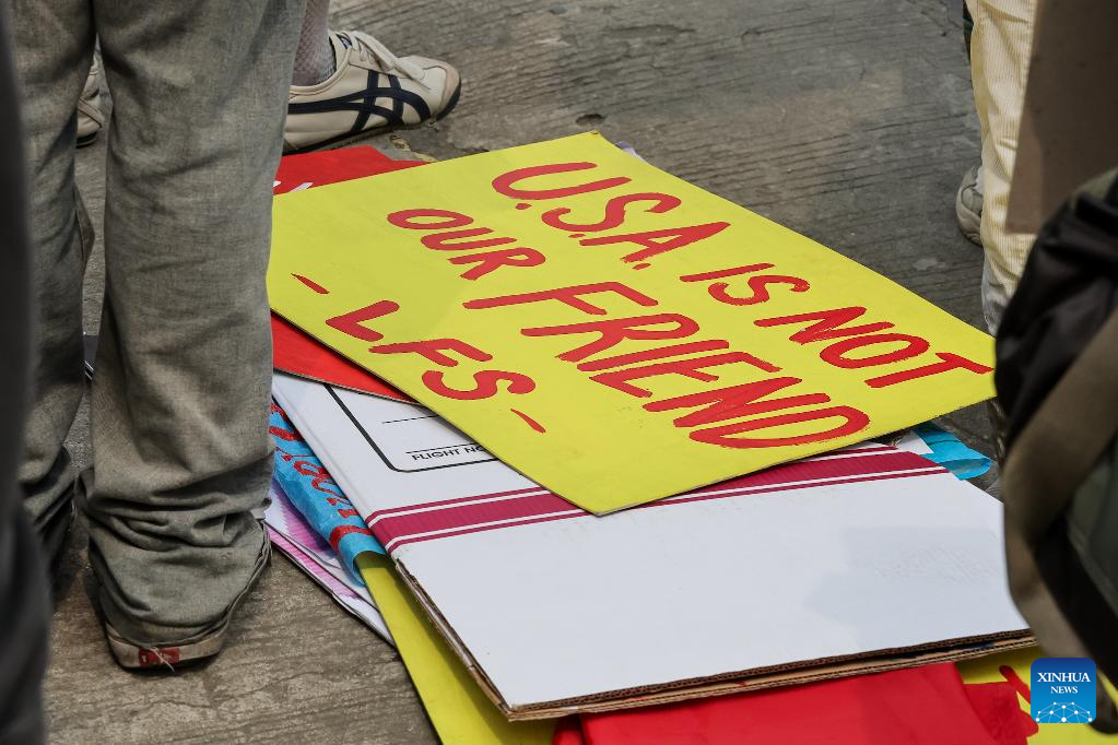 Filipino protesters held a rally outside the headquarters of the Armed Forces of the Philippines on Monday morning, holding placards reading "Stop Balikatan,""Pull out U.S. troops and missiles," and "U.S. imperialist No.1 Terrorist." (Xinhua/Rouelle Umali)