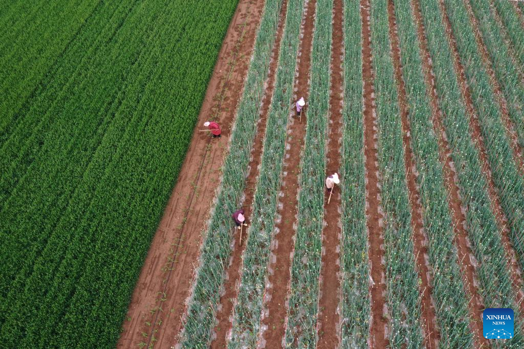 An aerial drone photo taken on April 20, 2026 shows farmers harvesting scallions in Duotian Subdistrict, Xinghua City, east China's Jiangsu Province.