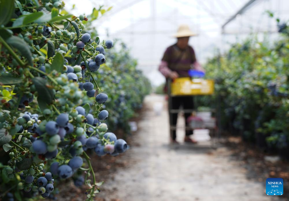 A villager harvests blueberries at a blueberry plantation in Chengjiang, southwest China's Yunnan Province, April 20, 2026.