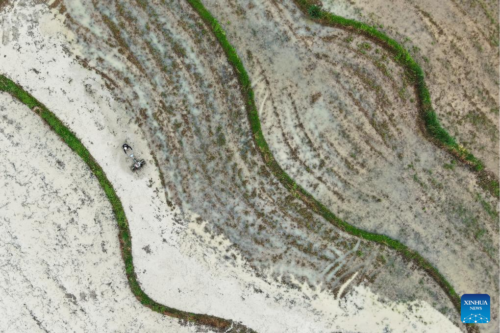 An aerial drone photo taken on April 20, 2026 shows a farmer preparing paddy fields in Pingbaying Town, Xianfeng County, Enshi Tujia and Miao Autonomous Prefecture, central China's Hubei Province.