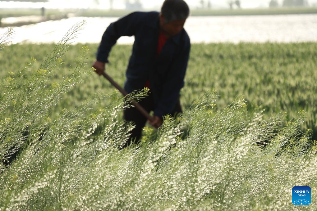 Farmers harvest garlic scapes in a field in Xilingsi Town, Suixian County, Shangqiu City, central China's Henan Province, April 20, 2026.