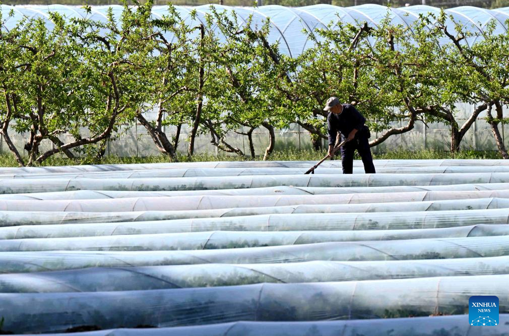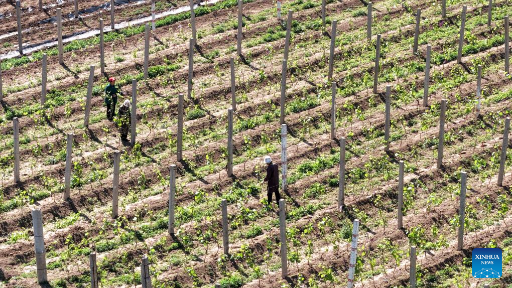 An aerial drone photo taken on April 20, 2026 shows farmers working in a vineyard in Zhoujiazhuang Township, Jinzhou City, Shijiazhuang, north China's Hebei Province.