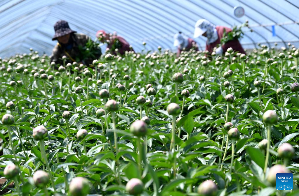 Flower farmers harvest fresh cut peonies at a peony cultivation base in Yijing Town, Fengfeng Mining District, Handan, north China's Hebei Province, April 20, 2026.
