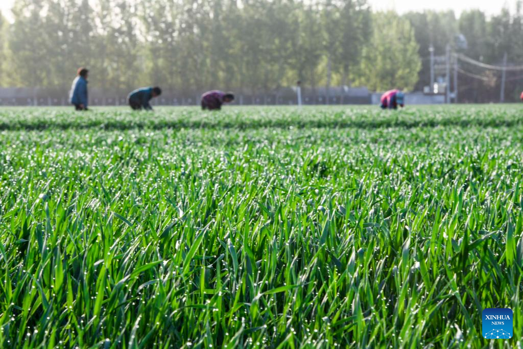 A farmer weeds in a wheat field in Mashang Township, Neihuang County, Anyang, central China's Henan Province, April 20, 2026.