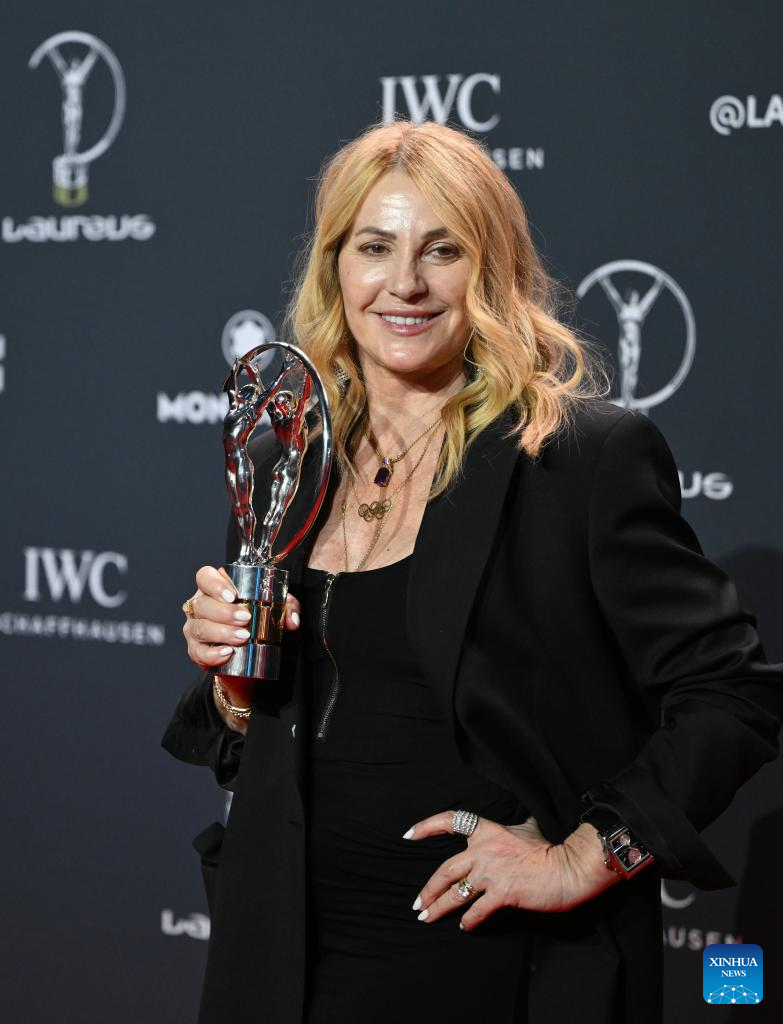 Nadia Comaneci poses with Laureus Lifetime Achievement Award during the 2026 Laureus World Sports Awards ceremony in Madrid, Spain, April 20, 2026. (Xinhua/Cheng Min)
