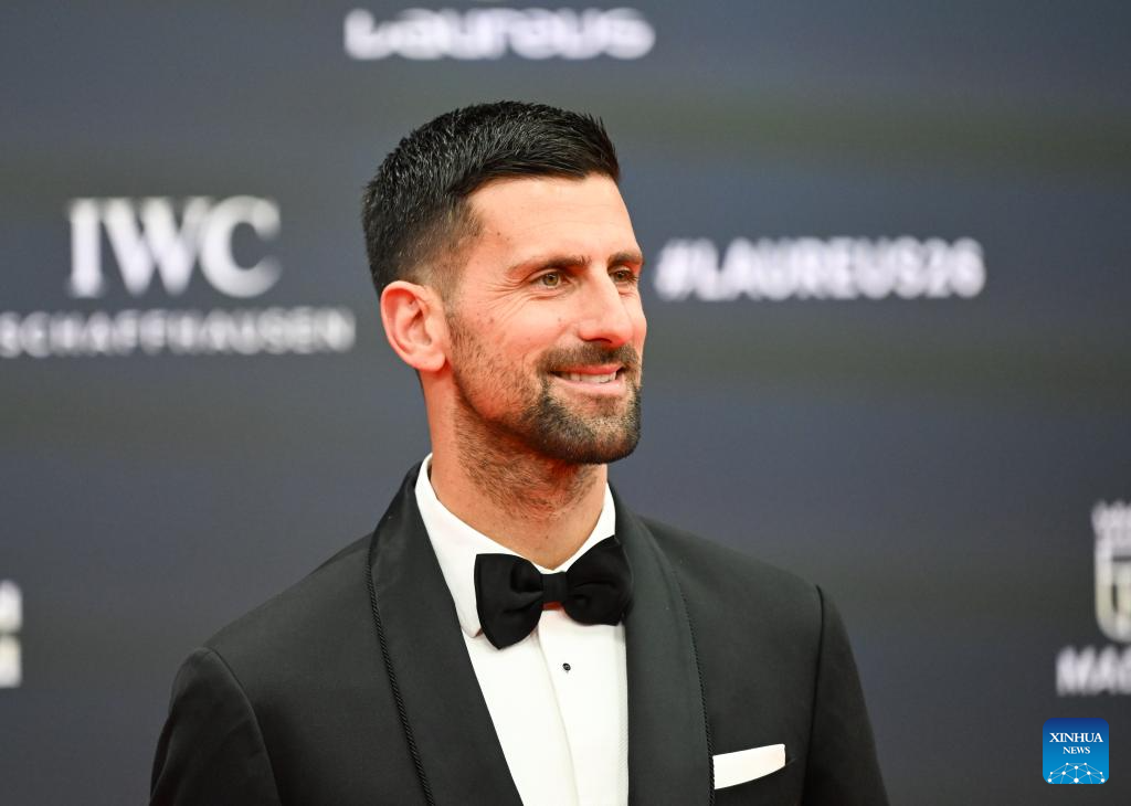 Novak Djokovic poses on the red carpet before the 2026 Laureus World Sports Awards ceremony in Madrid, Spain, April 20, 2026. (Xinhua/Cheng Min)