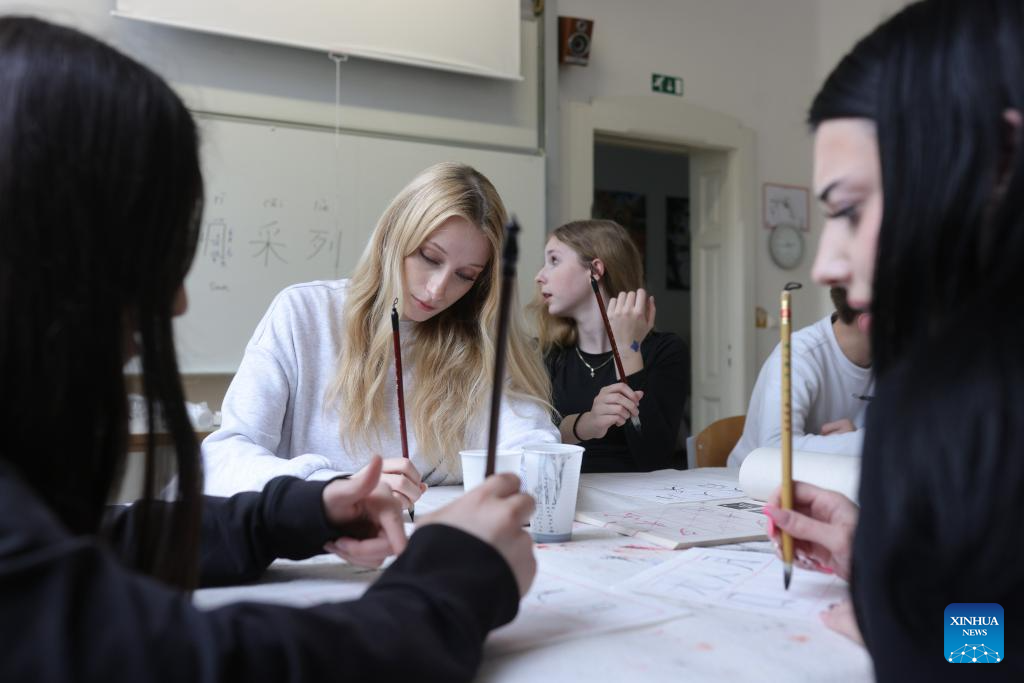 Students participate in a Chinese calligraphy workshop during an event marking the International Chinese Language Day at a high school in Celje, Slovenia, April 20, 2026. (Photo by Zeljko Stevanic/Xinhua)