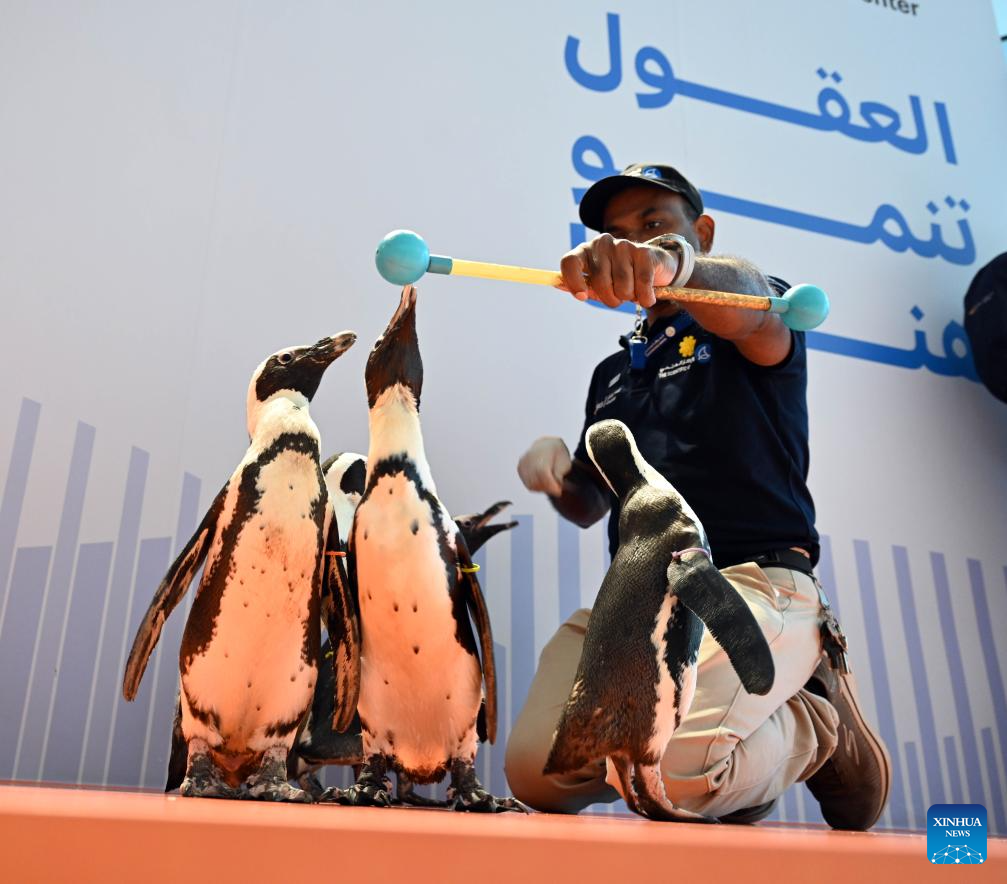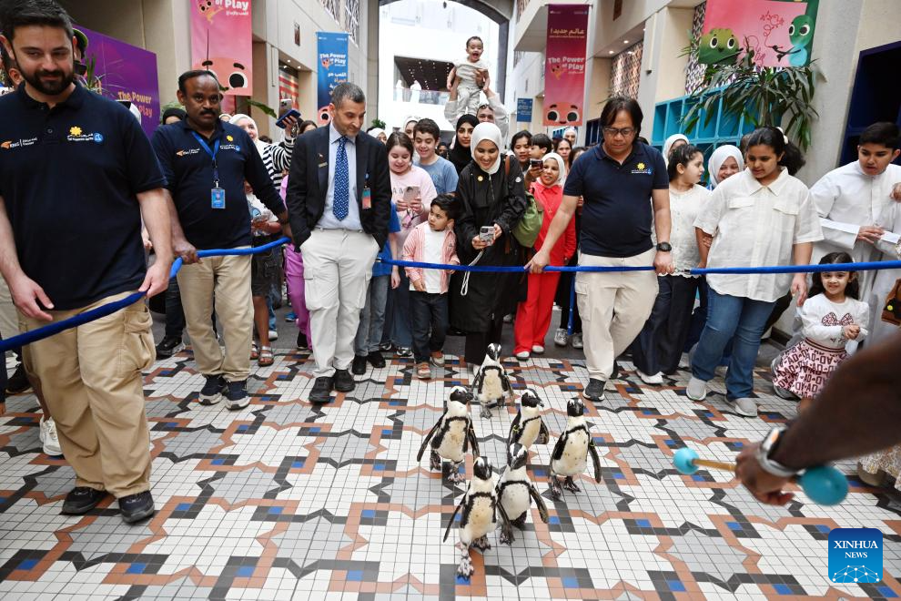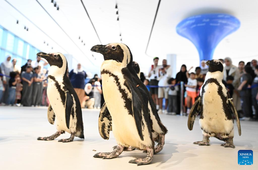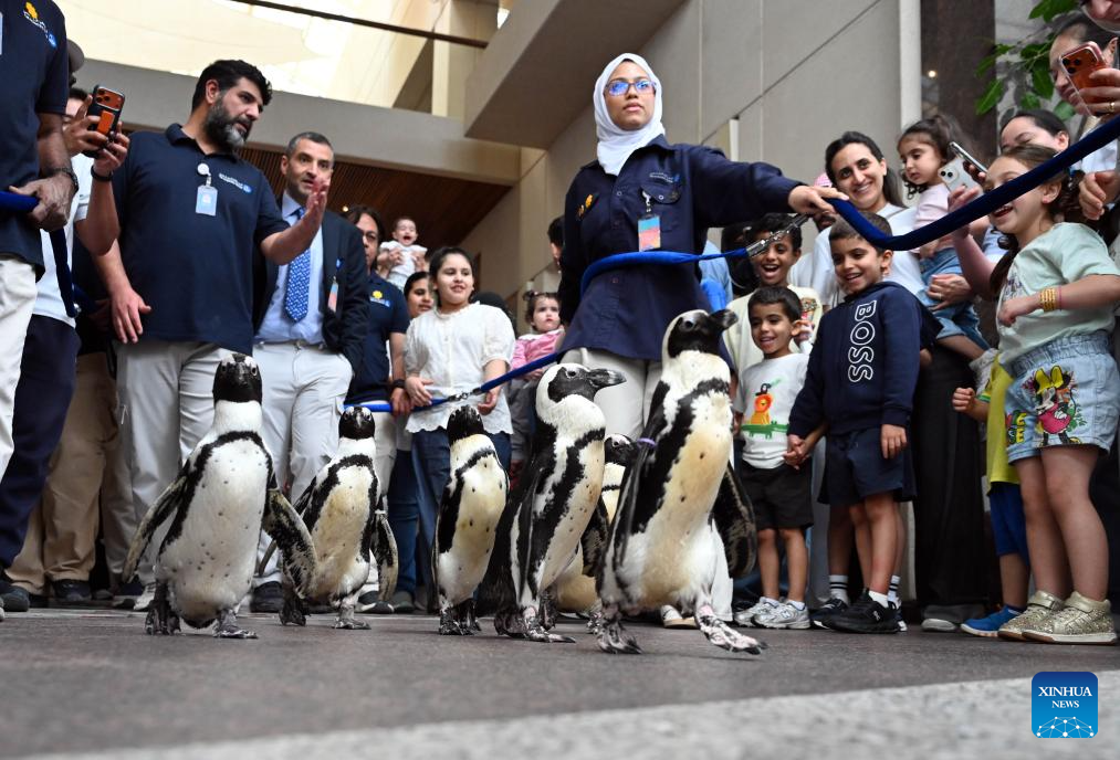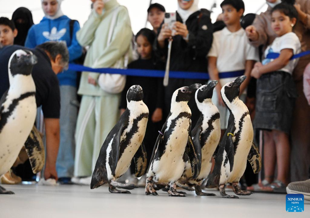 Penguins are pictured during a Penguin Walk interactive activity at the Scientific Center in Hawalli Governorate, Kuwait, April 21, 2026. The Scientific Center of Kuwait has recently launched a Penguin Walk interactive program, allowing visitors to observe penguins up close under staff supervision while learning about their habits and marine conservation. (Photo by Asad/Xinhua)