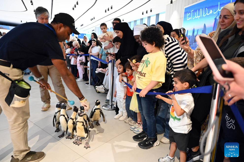 People participate in a Penguin Walk interactive activity under staff guidance at the Scientific Center in Hawalli Governorate, Kuwait, April 21, 2026. The Scientific Center of Kuwait has recently launched a Penguin Walk interactive program, allowing visitors to observe penguins up close under staff supervision while learning about their habits and marine conservation. (Photo by Asad/Xinhua)