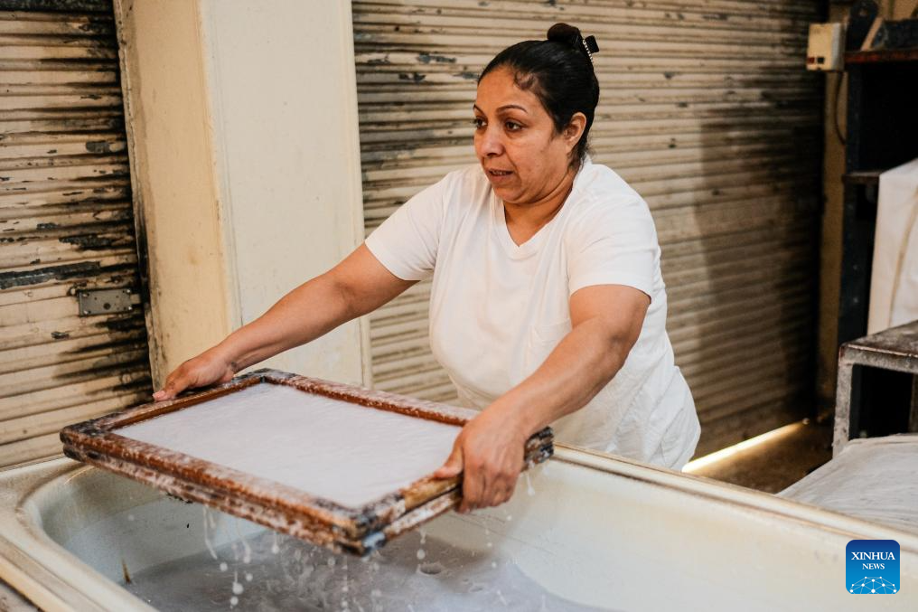 A worker filters the pulp at a workshop in Manshiyat Naser, also known as Garbage City, in Cairo, Egypt, on April 21, 2026.(Xinhua/Xin Mengchen)