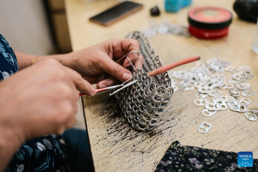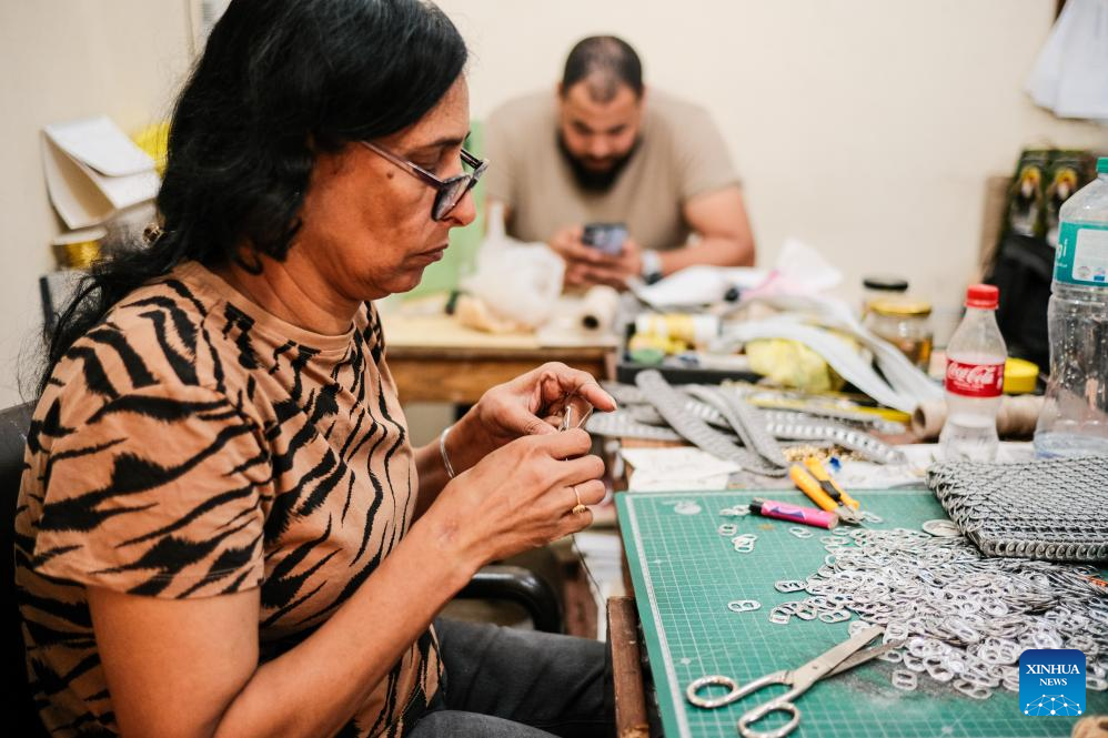 A worker makes a ring buckle bag made from can tabs at a workshop in Manshiyat Naser, also known as Garbage City, in Cairo, Egypt, on April 21, 2026.(Xinhua/Xin Mengchen)